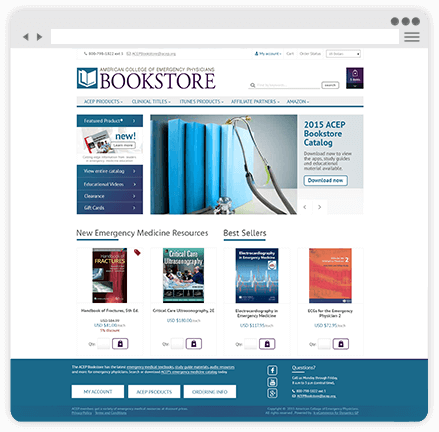 La librairie virtuelle ACEP offre des manuels d'urgence médicale, des matériaux de guide d'étude, des ressources audio et encore plus pour les médecins d'urgence. Pour cette clientèle très spécialisée, son site transactionnel devait refléter un portail au site corporatif.