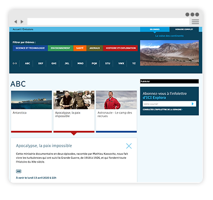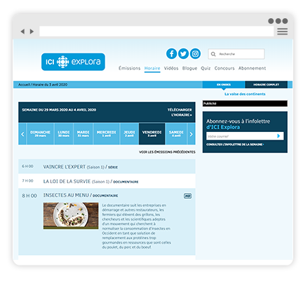 Site officiel de la chaîne télé ICI Explora conçu et mise à jour par l'entreprise Version10. Ce site propose une navigation multi-plateforme et offre du contenu informatif à propos des émissions en diffusion, de l'horaire télé, un CMS ainsi qu'un blogue d'informations exclusives.