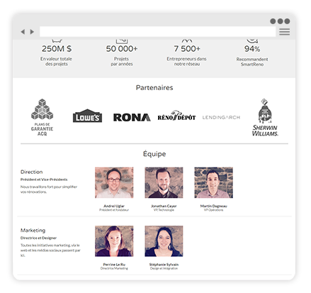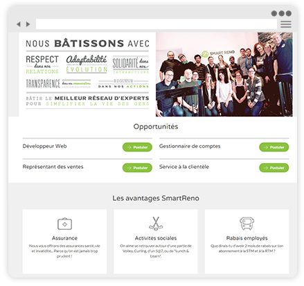 En tant que graphiste, j'ai créé pour Smart Reno une toute nouvelle identité visuelle. Définir une charte graphique au goût du jour a été l'un de mes mandats. Superviser par la directrice au marketing, et assister de l'équipe technique, nous repoussons sans cesse les limites de l'expérience utilisateur.