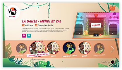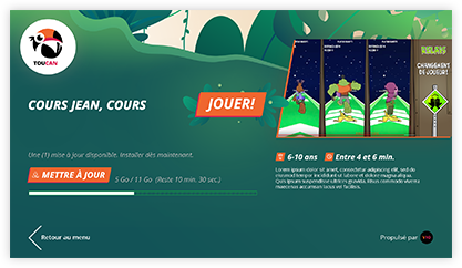 Un total de 8 jeux sont proposés sur la plate-forme Toucan. Celle-ci comprend des licences affiliées à des personnages déjà aimés par les jeunes tels que l'Agent Jean et l'astronaute David Saint-Jacques. D'autres jeux utilisent des univers complètement inédits que j'ai conçu au sein de l'équipe.